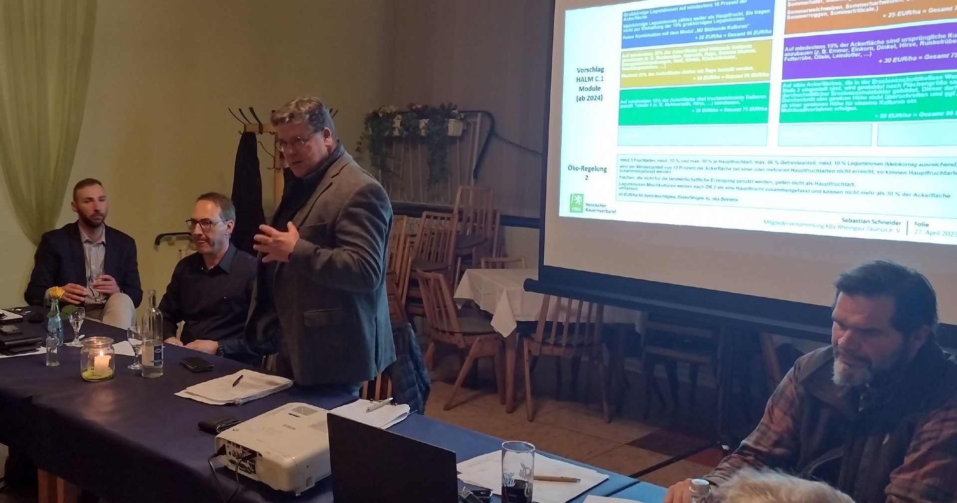 Bei der Mitgliederversammlung am 27. April 2023 in Steckenroth konnte der Vorsitzende Thomas Kunz zahlreiche Mitglieder begrüßen. Die zur Wahl stehenden Vorstandsmitglieder Günter Heckel, Jan Volkmar, Björn Schneider und Thomas Hahn wurden ohne Gegenstimme in ihren Ämtern bestätigt. Die Kassenprüfer bescheinigten der Geschäftsführung eine ordentliche Kassenführung und die Versammlung erteilte dem Vorstand sowie der Geschäftsführung einstimmig Entlastung für das Geschäftsjahr 2022. Nach den Regularien referierte Sebastian Schneider, agrarpolitischer Referent des Hessischen Bauernverbands, unter dem Titel „Lehre aus den Krisen = Konsequenzen für die nationale Agrarpolitik?“ zur Entwicklung der Landwirtschaft in der jüngsten Zeit und machte dabei die Herausforderungen für die Landwirtschaft im „Geschäftsmodell Deutschland deutlich.